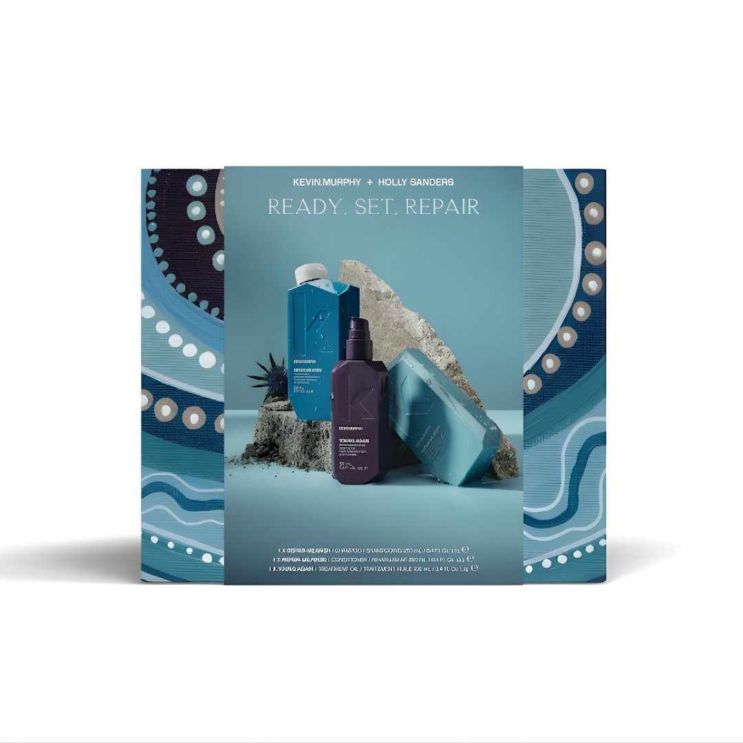 Le coffret Ready, Set, Repair de Kevin Murphy est une édition limitée conçue pour redonner vie aux cheveux abîmés, secs ou fragilisés. Illustré par l’artiste australienne Holly Sanders, ce coffret allie réparation profonde, nutrition intense et éclat durable dans une routine complète.